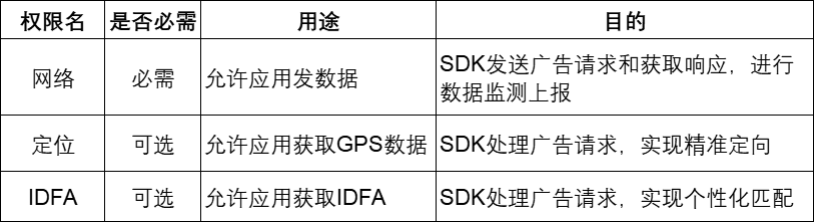 为实现以上功能,尊龙凯时|品友SDK会在用户知悉并授权同意的前提下,收集开发者应用调用 SDK 接口的信息,并调用相关权限。具体如下:
