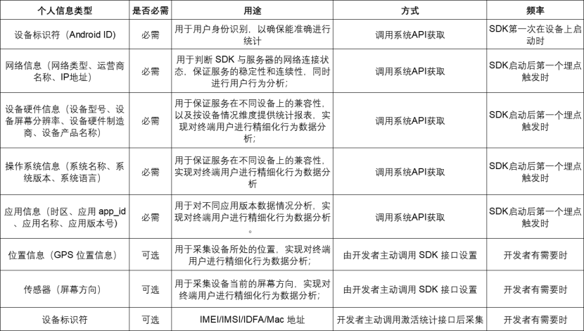 • 基础功能:在开发者应用中进行广告投放,包括广告展示、广告监测、广告归因、广告效果优化,以及应用程序运行过程中的启动、关闭、广告曝光、点击等用户行为数据监测。
